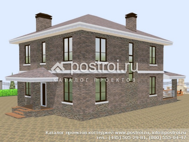 U-189-1P проект двухэтажного дома из пеноблоков размером 13 на 10. Большая студия - кухня-гостиная-столовая - с выходом на террасу разделяет зону дневного пребывания и отдыха, правая часть с гостевой комнатой, гардеробной и котельной, которая выполнена в соответствии требованиями газовых служб, т.е. Вы совершенно спокойно располагаете в ней напольный газовый котел и сопутствующее оборудование. Второй этаж двухэтажного пеноблочного коттеджа содержит три большие спальни, два гардероба и просторную ванную комнату. Проект разработан из пенобетона толщиной 400 мм с облицовкой кирпичом 120 мм контрастных оттенков. Цоколь, угловые зоны и колонны обрамлены искусственным камнем.