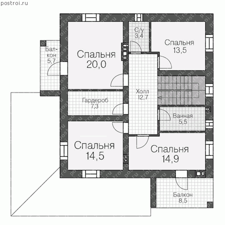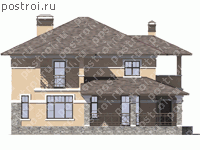 Планировка дома, общей площадью 197 кв.м, располагает двумя полноценными этажами высотой 2,8 м. Также, привлекает свое внимание крытая угловая терраса, позволяющая обедать на свежем воздухе. Проект, предоставлен с наружными стенами из поризованного кирпича, также возможен вариант из газобетона. Основанием для дома служит монолитная ж/б плита, чердачная кровля, покрытая мягкой черепицей. Планировка первого этажа, представляет: кухню-столовую, гостиную с камином, гостевую спальню, кабинет, санузел с возможной установкой душевой кабины. Четыре спальни, ванная комната, санузел и одна большая гардеробная запроектированы на втором этаже. В планировке дома, предусмотрено два балкона