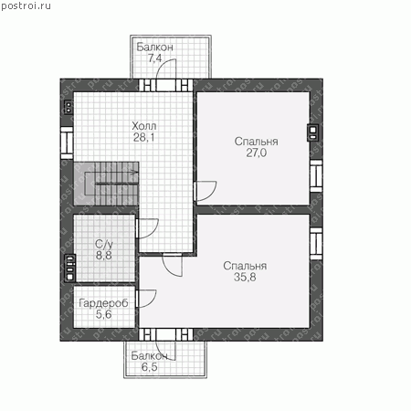 Двухэтажный дом из газобетона 400 мм, габаритами 12,0 на 12,0 м и общей площадью – 210 кв.м. Интересным решением, является устройства гардеробной под лестницей, комната хоть и имеет маленькую площадь, но при рациональном использовании может быть очень полезной. На первом этаже располагается две небольшие спальни, санузел с ванной, выделено место для устройства котла. Также с кухни-столовой есть выход задний дворик где расположена небольшая терраса. Второй этаж предусмотрен с большой ванной комнатой, гардеробной хорошей площадью, двумя спальнями и балконами. Материал для стен, может быть использован не только газобетон, но и поризованный кирпич 510 мм. При заказе проекта уточняйте
