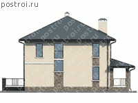 Проект дома с угловой террасой и эркером рассчитан на постоянное проживание семьи из 3-4 человек. Наружные стены дома выполнены из газобетона. В наружной отделке дома использованы штукатурка, камень, деревянные декоративные элементы. Главным украшением фасада является терраса с арочными проемами, облицованными камнем, и верхняя терраса над ней. Вторая терраса первого этажа находится с левой стороны дома. Соответственно, в доме два входа: в тамбур и далее, в холл и основные помещения дома или в кухню-столовую. Гостиная занимает пространство эркера, а гостевая спальня расположена поблизости от санузла и лестницы на второй этаж, который отведен под приватную зону. В распоряжении хозяев – три спальни, гардеробные, ванные комнаты. Из холла можно попасть на верхнюю террасу. Для удобства застройщика разработан зеркальный проект.