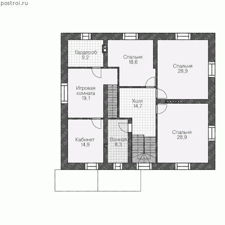 Проект большого кирпичного дома, запроектирован общей площадью 302,37 кв.м с осевыми размерами 13,88 на 14,08 м. Надежным основанием служит ленточный фундамент, кирпичные стены с наружной отделкой лицевым кирпичом, кровельным покрытием служит металлическая черепица. Планировка, предусматривает проживание двух семей, на первом этаже располагается две кухни, два санузла, две гостиные, спальня, котельная, длинный гараж для двух машины. Также в проекте представлен отдельно стоящий кирпичный погреб. Три спальни, игровая комната, кабинет для работы на дому, гардеробная, большая ванная, совмещенная с санузлом располагаются на втором этаже