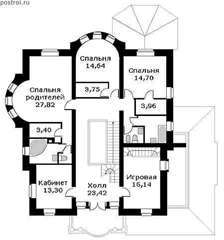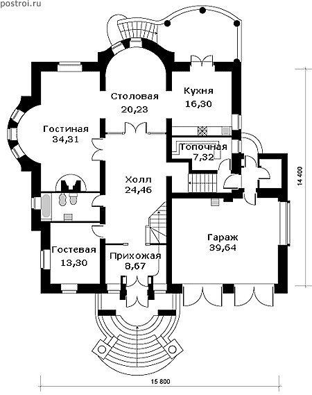 Двухэтажный коттедж с гаражом для двух автомобилей, запроектирован из кирпича, общей площадью 345 кв.м и габаритами 14,4 на 15,8 м. Большой загородный дом, рассчитан для комфортного проживания семьи из 3-5 человек. На главном фасаде, выделяется парадный вход с балконом, обустроенный красивой наружной лестницей. Планировка первого этажа, располагает прихожую, гостевую спальню, котельную, гостиную с камином и полукруглым эркером, визуально увеличивающим внутреннее пространство помещения. Из кухни, предусмотрен выход на террасу. Родительская спальня с личной ванной комнатой и гардеробной, две детские, игровая, общая ванная комната, санузел запроектированы на втором этаже кирпичного коттеджа. Также для хозяев, работающих на дому, выделено место для устройства кабинета. Проект кирпичного дома с гаражом, разработан в варианте с цокольным этажом
