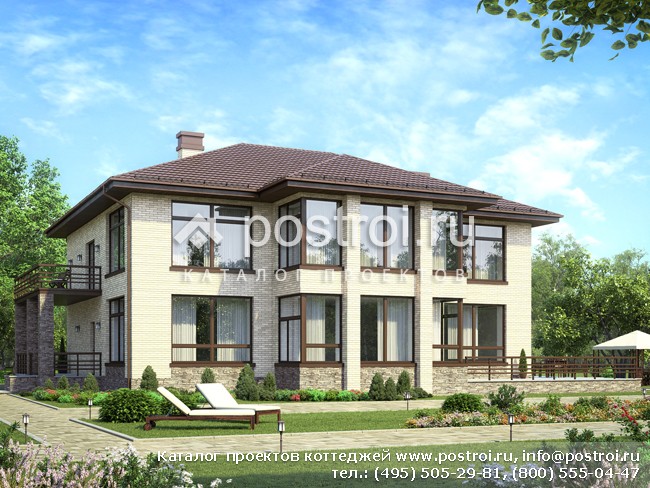 Проект кирпичного дома, общей площадью 350 кв.м и габаритами 18,16 на 15,0 м, представлен с большими выделяющимися окнами, которые открывают вид на красивый пейзаж. На входе в дом, запроектировано крыльцо, также располагается на заднем дворе угловая терраса с входом на кухню. Наружные стены из поризованного кирпича 510 мм с отделкой лицевым кирпичом, тип кровли – чердачный. Первый этаж, запроектирован с гостевой спальней, бойлерной, ванной комнатой, отдельно санузлом, для верхней одежды предусмотрена гардеробная. В планировке, одно большое общее помещение с выделенными зонами кухни, столовой и гостиной с камином. Преимущества кирпичного дома, не только в больших красивых окнах, но и в планировке, которая располагает пять спален на втором этаже и две ванные комнаты объединённые с санузлами, также предусмотрен балкон. Данный проект, разработан для большой семьи
