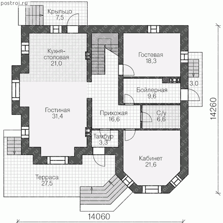 Вариант двухэтажного дома из газобетона с полноценным верхним этажом меньшей площади