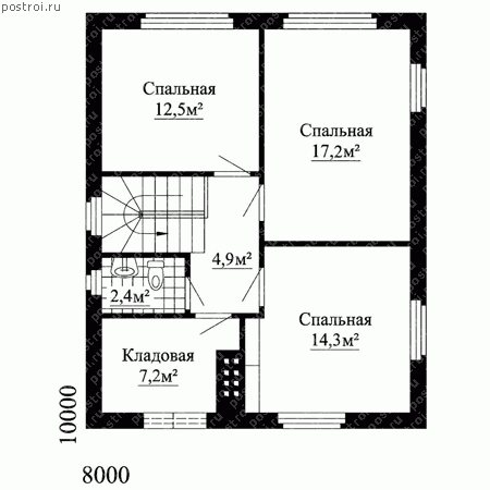 Добротный кирпичный дом для большой семьи, на первом этаже которого компактно размещена входная зона с прихожей, ванной комнатой и санузлом. Половину площади первого этажа занимает гостиная и кухня. Для гостей или для проживания пожилого члена семьи предусмотрена спальня на первом этаже. На второй этаж, полноценный по высоте, ведет лестница с забежными поворотными ступенями. Из небольшого холла второго этажа можно попасть в три уютные спальни, ванную комнату и кладовую. Наличие отдельной вместительной кладовой повышает уровень комфорта проживающих в доме, ее можно использовать в качестве гардеробной. Следует отметить, что внешний облик дома делают очень привлекательным и аккуратным правильные пропорции фасадов, простая двускатная кровля, наружная отделка облицовочным кирпичом (либо штукатуркой), а также интересная и разнообразная конфигурация окон.
