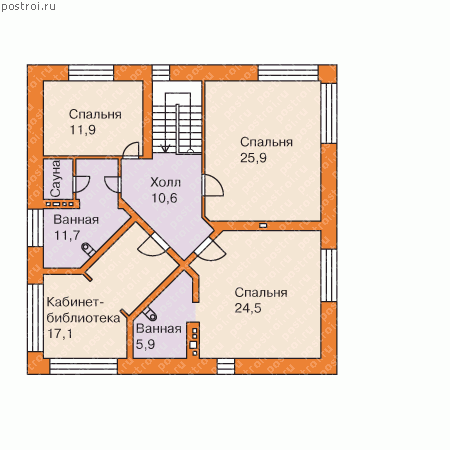 Загородный дом с кабинетом – библиотекой имеет интересную задумку для людей, которые умеют совмещать приятное с полезным, и отдохнуть с семьей и уделить время работе в отведенном для этого месте. Кухня –столовая по своим размерам более чем средняя но терраса которая совмещается с ней она просто огромная, что позволяет, проводит большие мероприятия на свежем воздухе. Прихожая имеет хорошую площадь, что дает возможность установить дополнительную мебель. Запроектирована на первом этаже одна спальня, туалет совмещенный с ванной, гостиная с угловым остеклением. Лестница поворотного типа с забежными ступенями. Планировкой предусмотрено на втором этаже кабинета – библиотеки в котором можно и работать и отдыхать читая интересную книгу, 3 спальни в одной из которых находится личная ванная комната с санузлом и общая ванная с местом под стиральную машину.