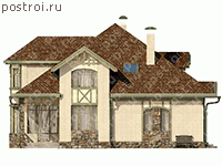 Дом с двумя спальнями на первом этаже, общей площадью 218,85 кв.м и габаритами 14,841 на 13,9 м. Возводится проект из газобетонных блоков с отделкой облицовочным кирпичом, для покрытия кровли используется битумная черепица. Планировка дома, предусматривает проживание большой семьи из 5-6 человек. Первый этаж, располагает две спальни, санузел с душевой кабиной, котельную с выходом на улицу, гостиную с камином, из столовой запроектирован выход на террасу. Зона столовой выделяется круглы эркером. Три спальни, большая ванная комната, санузел, библиотека представляют второй этаж. Также выделяется лестница со вторым светом. Проект двухэтажного дома, состоит из всех нужных данных для надежного строительства дома