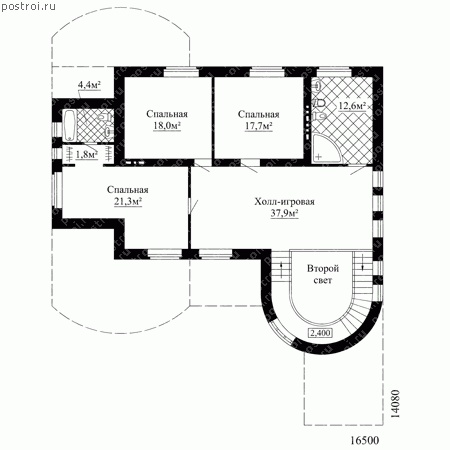 Проект кирпичного дома, общей площадью 278,7 кв.м и габаритами 17,59 на 16,5 м, представлен с зимним садом. Внешний дизайн проекта, является не однообразным типовым, а индивидуальным по стилистике за счет комбинированной наружной отделки в виде штукатурки и кирпича, по форме за счет устройства круглых эркеров на переднем фасаде, а также полукруглой террасы, расположенной на заднем дворе. Высота каждого этажа 3,0 м. На первом этаже, располагается гостиная с камином, кухня-столовая, котельная с место для зоны глажки и стирки белья. Спальня на первом этаже, позволяет разместить пожилых родственников. Также для хозяев, увлекающихся растительностью предусмотрен зимний сад, расположенный в зоне кругового эркера, который не только придает красивый вид комнате, но и увеличивает естественное освещение и внутреннее пространство. Дополнительным акцентом для зимнего сада, является второй свет. Родительская спальня предусматривает небольшую гардеробную и личную ванную комнату, для детских спален запроектирована одна большая ванная комната с санузлом, большой холл эксплуатируется как игровая зона. Проект с зимним садом, разработан в зеркальном варианте