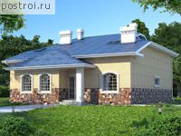 Большой двухэтажный дом из кирпича, общей площадью 280,1 кв.м и габаритами 16,32 на 14,0 м. Запроектирован на ленточном сборном фундаменте, наружные стены из кирпича с отделкой штукатуркой или возможно лицевым кирпичом, для кровельного покрытия применяется металлопластиковая черепица. Планировка дома не типовая, поскольку включает такие помещения как устройство библиотеки, рабочего кабинета, для комфортного проживания пожилых родственников спальню на первом этаже. Мансардный этаж, располагает большую родительскую спальню, обустроенную с большим оконным проемов в виде дуги, две детские спальни, большую ванную комнату, просторный холл предусматривает камин, также запроектирован небольшой чердак. Двухэтажный дом из кирпича, разработан для семьи из 3-4 человек