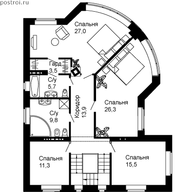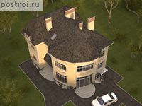 Необычный дом 15.3 на 11.9 с общей площадью 338 кв.м, запроектирован с интересной формой, в котором один угол выполнен в виде полукруга. Проект возводится на сборном ж/б фундаменте, наружные стены из кирпича с отделкой штукатуркой, в виде кровельного покрытия, используется металлическая или мягкая черепица. Планировка дома 15,3 на 11,9 м, позволяет разместить семью из 4-5 человек. Цокольный этаж, представляет зону отдыха, в котором можно посетить бильярдную, парную с комнатой отдыха и бассейном, тренажерную, мастерскую. На первом этаже, располагается тамбур с зоной для верхнего гардероба, кабинет, санузел, кладовая, кухня, столовая, просторная гостиная, внутреннее пространство, которой дополнительно увеличивается за счет необычной формы стен и устройства панорамного остекления. Второй этаж, запроектирован с четырьмя спальнями, большой ванной комнатой с санузлом и душевой кабиной, в родительской спальня обустроена гардеробная. Кирпичный дом 15,3 на 11,9 м, разработан в зеркальном варианте