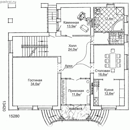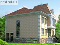 Двухэтажный дом с цокольным этажом, запроектирован общей площадью 406,7 кв.м и габаритами 13,42 на 15,28 м. В проекте в виде основания представлен ленточный сборный фундамент, стены из кирпича, с наружной отделкой штукатуркой или облицовочным кирпичом, кровельные покрытием служит металлическая или мягкая черепица. Цокольный этаж, располагает сауну с комнатой отдыха, бильярдную, кладовую, котельную, санузел с душевыми. На первом этаже, запроектирована прихожая с местом для верхнего гардероба, гостиная, кухня-столовая, большая ванная комната, санузел и каминная. Зона отдыха хозяев, представлена на втором этаже в виде четырех спальне, общей ванной комнаты, совмещенной с санузлом и лоджии. Общая планировка двухэтажного дома с сауной на цокольном этаже, позволяет разместить семью из 4-5 человек. Проект разработан в варианте с устройством гаража