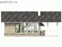 Беседка с комнатой отдыха, общей площадью 26,15 кв.м и габаритами 4,65 на 9,15 м, представляет открытую террасу, которая позволяет в хорошую погоду расположить небольшую компанию. Стены запроектированы из деревянного каркаса, кровельным покрытием служит металлическая черепица. Высота этажа 3,03 м. В проекте беседки с комнатой отдыха, предусмотрен просторный санузел. Также разработан зеркальный вариант