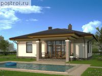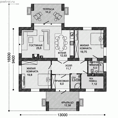 На сайте представлены планы архитектурно-строительного проекта – одноэтажный дом 13 на 16,5 из газобетонных блоков 400 мм, с утеплением. В качестве фундамента предусмотрена мелкозаглубленная монолитная железобетонная плита. Перекрытия по проекту – деревянные, низ стропильных рам по балкам. Простая геометрия прямоугольных фасадов дома – 13 на 9.4 без учета крылец. Планировка решена рационально – минимум транзитных зон. В распоряжении хозяев одноэтажного дома 13 на 16,5: гостиная, объединенная с кухней с выходом на террасу, две жилые комнаты, разделенные холлом, ванная, санузел, техническое помещение для размещения отопительного оборудования.