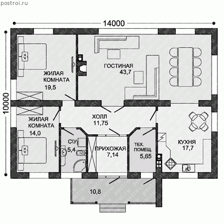 Проект одноэтажного дома из газоблоков, общей площадью 135,64 кв.м и габаритами 10,0 на 14,0 м. Данный проект, отлично подойдет небольшой семье, для дачного участка. Компактный загородный дом, основан на мелко заглублённой ленте, стены из газобетона 400 мм с утеплителем, перекрытие деревянное, для покрытия кровли используется металлическая черепица. Планировка одноэтажного дома, располагает крыльцо, отдельный вход в техническое помещение, прихожая позволяет обустроить гардеробную для верхней одежды, две спальни, гостиная с камином совмещена с зоной столовой. Можно рассмотреть различные вариации данного дома в разделе варианты проекта