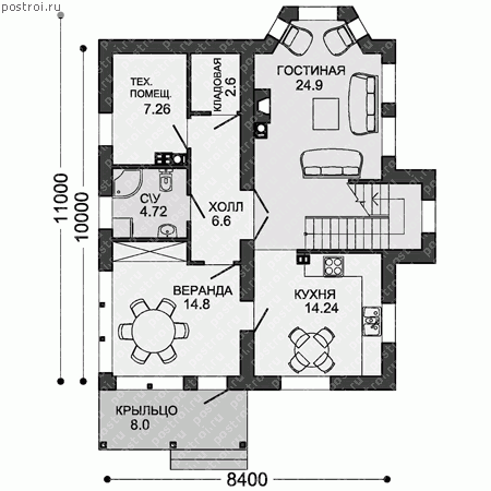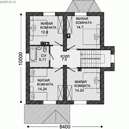 Коттедж из газоблоков, запроектирован на фундаменте в виде монолитной ж/б плиты, для наружной отделки стен используется штукатурка с декоративным камнем. Общая площадь коттеджа 150,71 кв.м и габариты 11,0 на 8,4 м. Первый этаж выделяется эркером, запроектированным в зоне гостиной, что делает комнату более интересней и визуально увеличивает пространство. Вход осуществляет с просторного крыльца, через веранду, в планировке первого этажа, также представлена гостиная с камином, санузел с душевой кабиной, техническое помещения, кладовая. На мансарде, располагается четыре спальни, ванная комната с санузлом. Также, данный коттедж из газоблоков, разработан в варианте с гаражом но без веранды