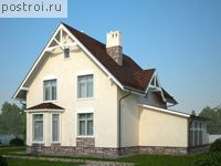 Аккуратный, с экономичной двускатной кровлей, загородный дом с гаражом и эркером, входит в категорию проектов общей площадью до 200 м. Стены коттеджа запроектированы из газобетонных блоков 400 мм с облицовкой штукатуркой и декоративным камнем. Разработан вариант дома с эркером – без гаража. Планировка предполагает наличие спальни на 1-ом этаже и 4-х жилых комнат в мансарде. По желанию застройщика установка каминной кассеты возможна в гостиной. Для размещения отопительного котла предусмотрено техническое помещение. Лестница в доме с гаражом и эркером удобна в эксплуатации – двухмаршевая, с междуэтажной площадкой, выполняется по индивидуальному заказу в организации, специализирующейся на данном виде работ.